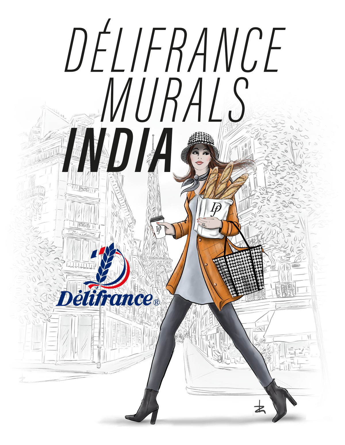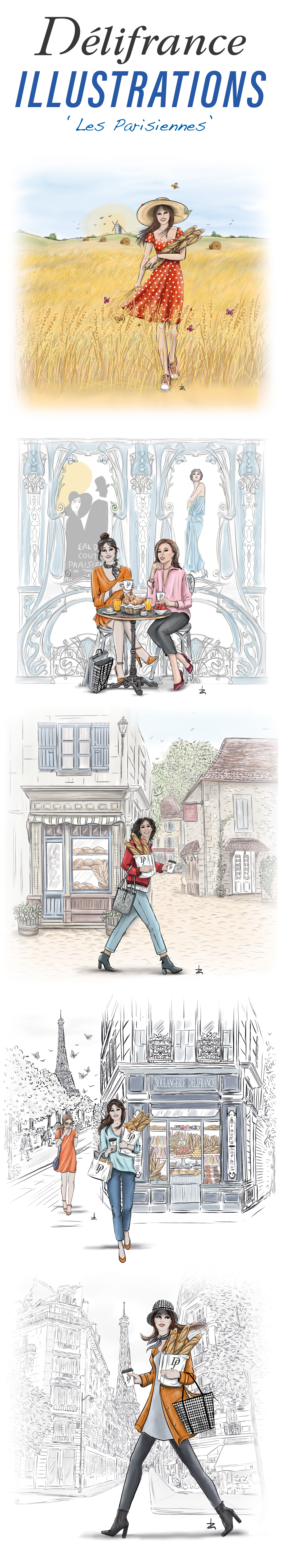 Concreet vormgevers liet zich voor dit ontwerp inspireren door de wereld van mode en parfumerie. Om het Franse gevoel extra kracht bij te zetten, zochten zij voor de illustraties de samenwerking met Linda Zoon. Haar kennis en gevoel voor mode gaven de doorslag voor deze opdracht. Na een testfase en verschillende voorschetsen besloot het team een serie basisillustraties ‘Les Parisiennes’ te laten ontwikkelen, waaruit Délifrance International een selectie kon maken.