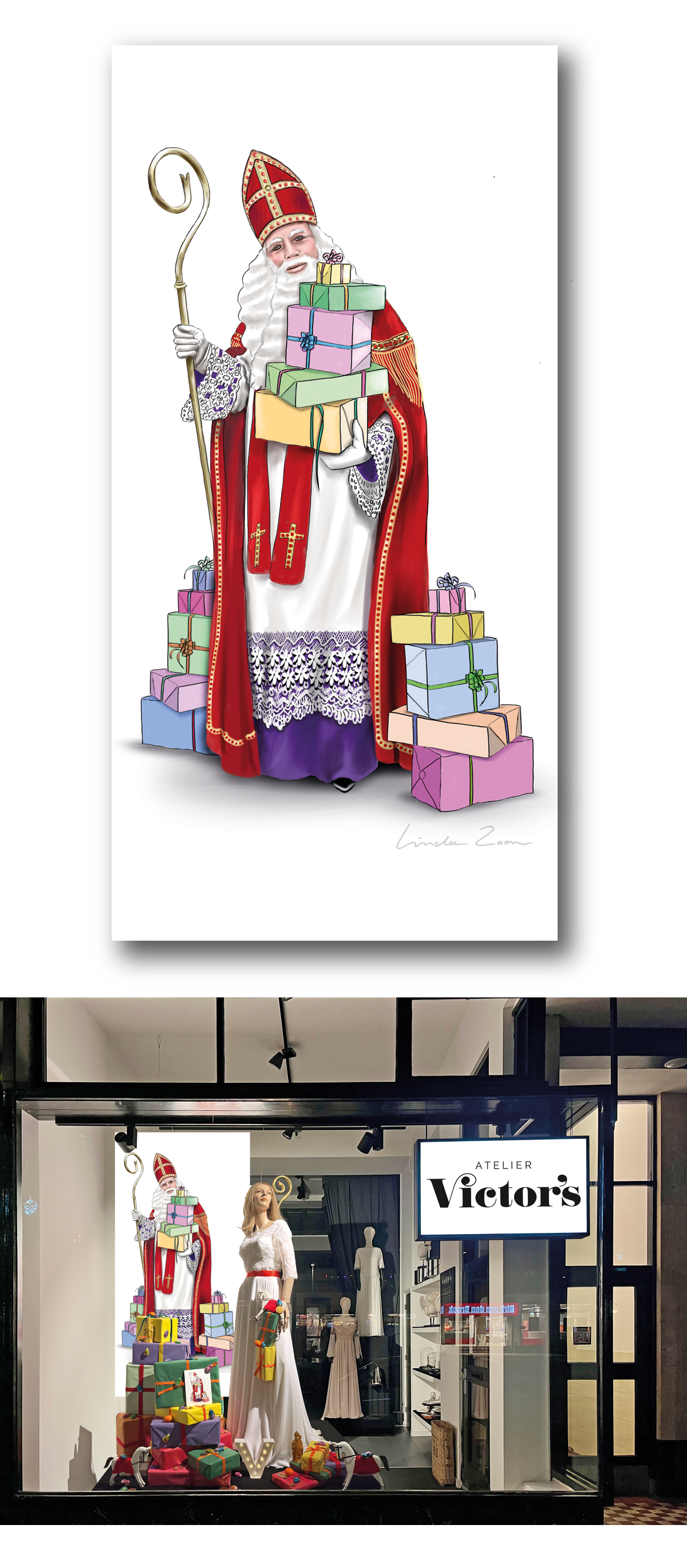 Victor is a well-known name in Rotterdam. His shop window on the Goudsesingel always turns heads, thanks to the striking posters Linda designs and illustrates especially for him. To celebrate the 35th anniversary, she creates a new poster each season — including a festive Saint Nicholas edition.