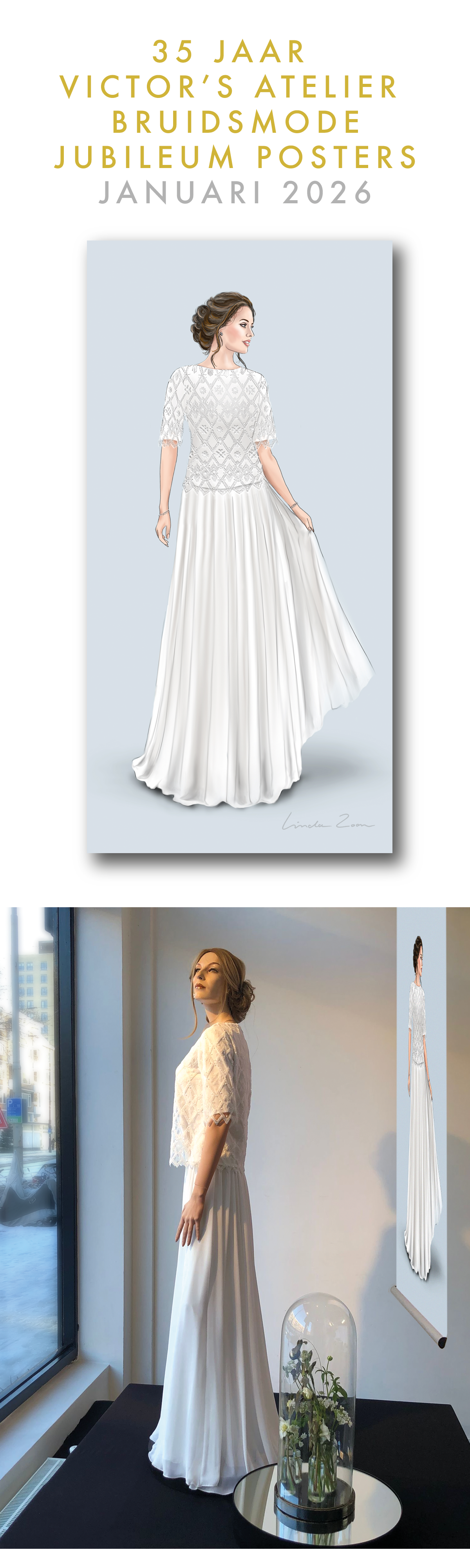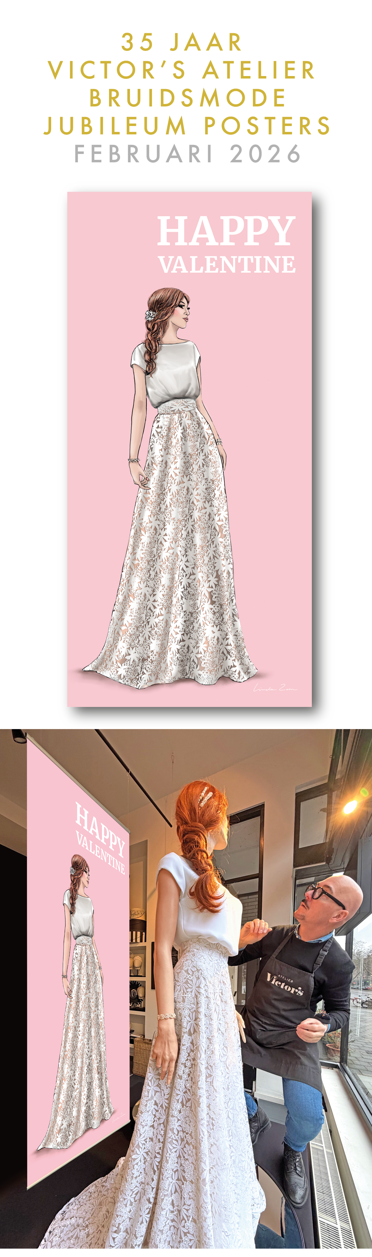In Rotterdam is Victor dan ook een bekende naam. Zijn etalage aan de Goudsesingel trekt altijd aandacht, dankzij de opvallende posters die Linda speciaal voor hem ontwerpt en illustreert. Voor het 35-jarig jubileum maakt ze elk seizoen een nieuwe poster, zelfs een feestelijke Sint-Nicolaas-versie.